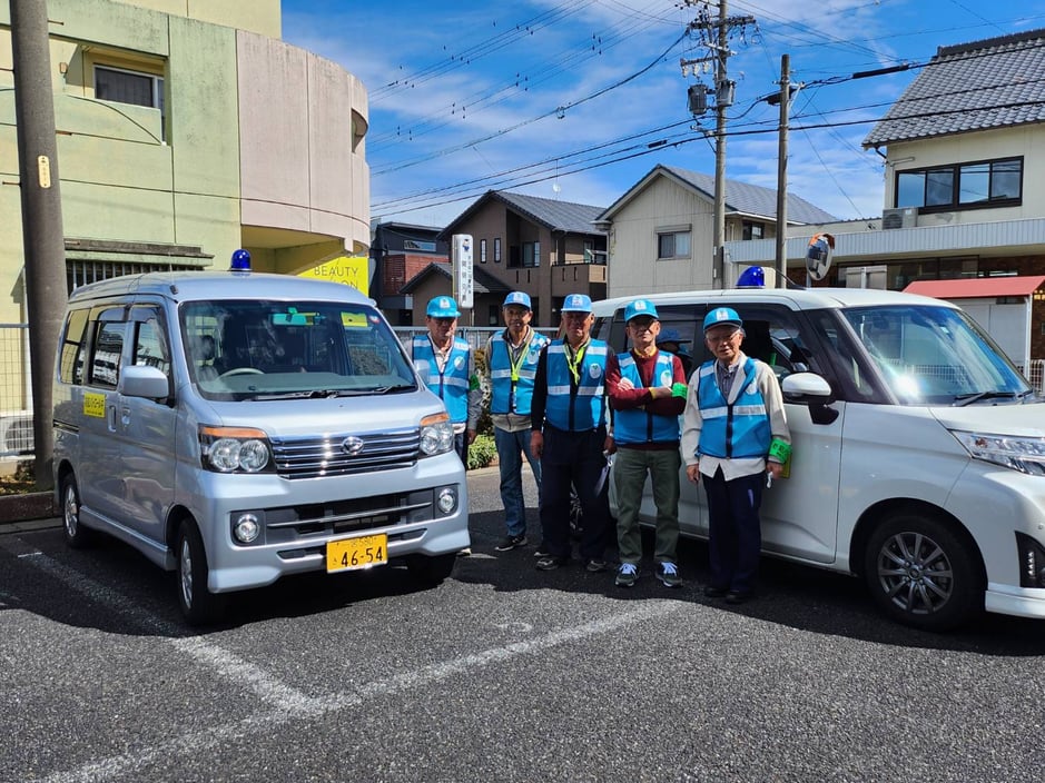 現在隊員25名、青色回転灯をつけた巡回車6台で、開明小学校連区内を巡回パトロールしています。