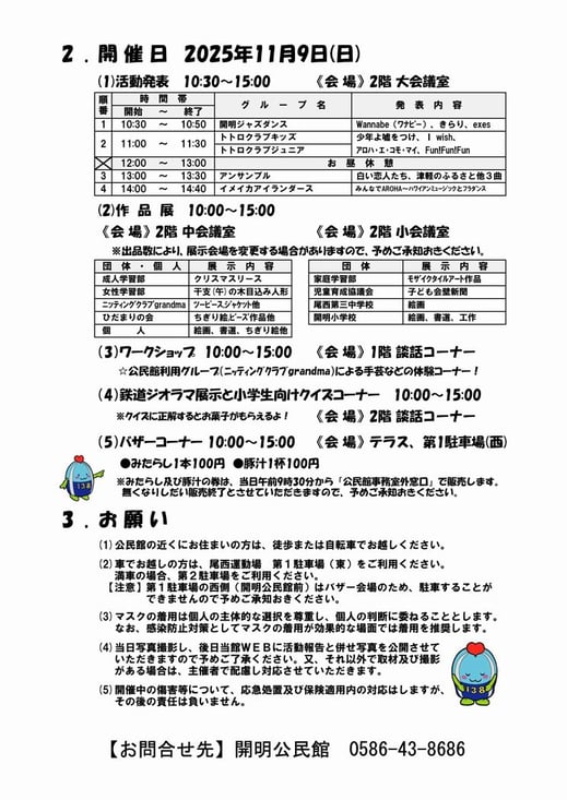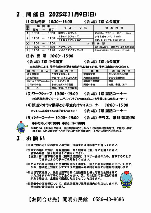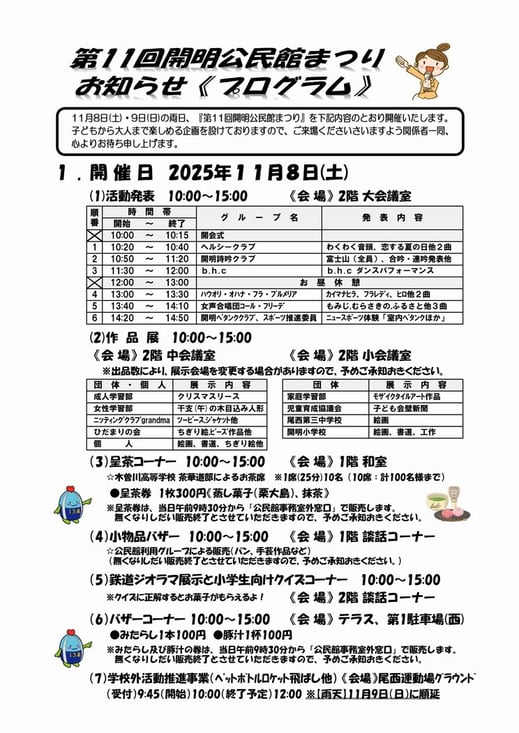 公民館からのお知らせ · 2025/10/17 第11回開明公民館まつりは11月8・9日です。「プログラム」ができました! 11月8日(土)9日(日)、「第11回開明公民館まつり」を下記内容のとおり開催いたします。 子どもから大人まで楽しめる企画を設けております。ぜひご来場ください!! ※画像をタップすると、拡大表示できます。 ※ダウンロードをご希望の方はこちら。 第11回開明公民館まつりのお知らせ(プログラム).pdf PDFファイル 308.0 KB ダウンロード tagPlaceholderカテゴリ: 公民館まつり
