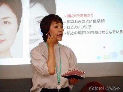 参加者のほとんどがマスクを着用されておりましたが、5月8日以降、5類感染症に移行したことにより、以前よりマスクを外すことも多くなることから、皆さん耳を傾け真剣な表情でメイクの指導を受けました。