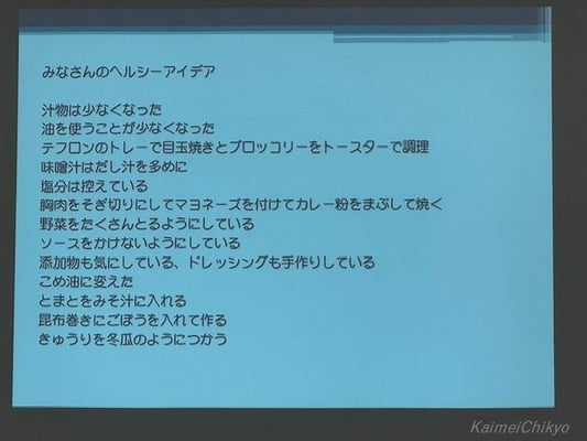 発表の中には、実際に病院食を担当した方から、実際、病によって塩分量の調整や出汁を多めに使うお話を聞きました。そのほか、添加物を気にしながらドレッシングを手づくりしていることや油をこめ油に変えたこと、トマトを味噌汁に入れる、キュウリを冬瓜のように使うなど、様々なアイデアが発表されました。