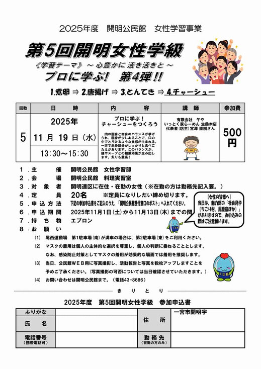 チラシ内「参加申込書」をご記入のうえ、「開明公民館受付窓口のポスト」へ提出ください。 - 申込期間: