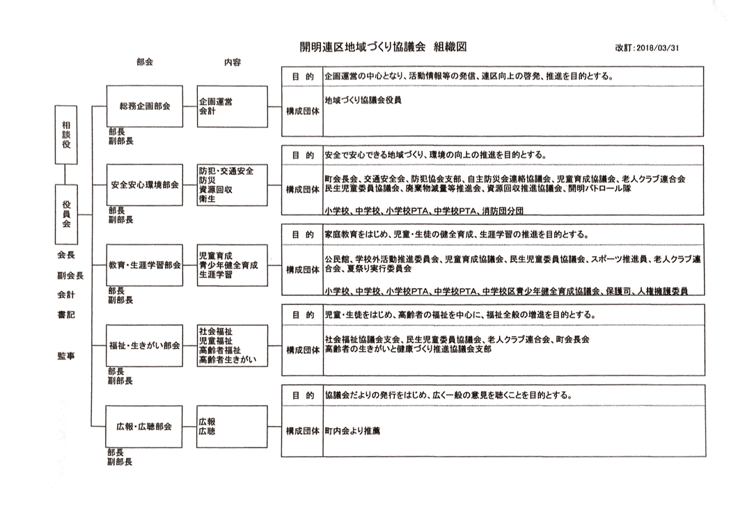 開明連区の地域づくり協議会の組織図は、次のようになっています。