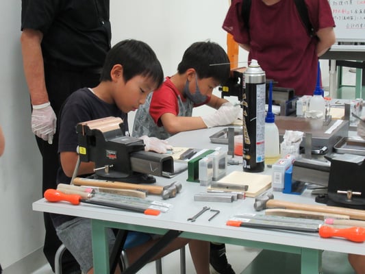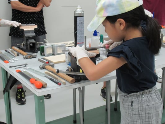 制作では、台座の手仕上げ(ヤスリがけ)やテイキン割印作業、レザー加工品自転車仕上げ作業(押し抜きや磨き)など、繊細な作業を親子で真剣に取り組んでいました。