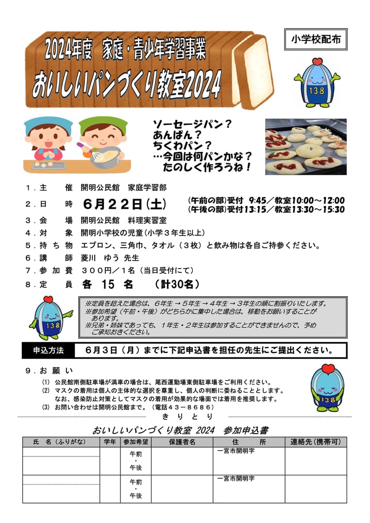 今年も「おいしいパンづくり教室」を開催します。申し込みをお待ちしています!