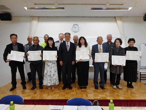 議事に入る前に、コロナ禍で出来なかった令和2年度から令和4年度までの、公民館役員として5年在職されご尽力賜りました16名の方をお招きして、「合同感謝状贈呈式」を挙行いたしました。