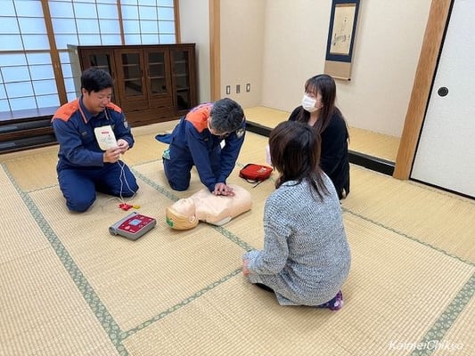 次に、同じく尾西消防署の落合副士長から、胸骨圧迫とAEDの講習を受けました。