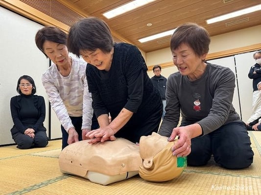 落合さんからは、胸骨圧迫のポーズを教えてもらい、実際に人体模型を使い20回圧迫を行いました。皆さんからは、垂直に体重が加えることができず、押し込みが甘く、簡単そうで難しいとの声があがり四苦八苦していました。