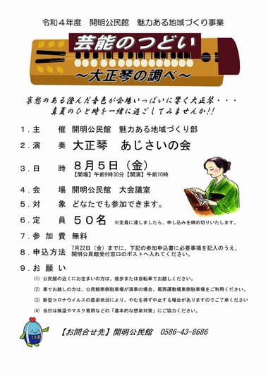 公民館からのお知らせ · 2022/06/26 【終了】「芸能の集い」~大正琴の調べ~申込受付中です。 魅力ある地域づくり部主催「芸能の集い」。 今年もあじさいの会をお招きし、すてきな大正琴の演奏会を開催していただきます。 申込みは 7月22日(金)までに、 申込書を開明公民館のポストへ。 定員の50名に達し次第、申込みを終了します。お申込みはお早めに。 *** <芸能の集い~大正琴の調べ~ 開催要項> 演奏:大正琴 あじさいの会 日時:8月5日(金)開場9:30 開演10:00 対象:どなたでも参加できます 定員:50名 参加費:無料 *** その他詳細はチラシをご確認ください。チラシ(PDF)はこちらからもダウンロードいただけます。 3.(魅力部)芸能のつどい.pdf PDFファイル 203.6 KB ダウンロード tagPlaceholderカテゴリ: 魅力ある地域づくり部