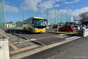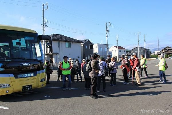 午前9時に公民館で受付と同時に参加者にリボンを配布し、バスの車内で魅力部の名倉部長から「そぶえイチョウ黄葉まつり臨時駐車場」と「黄葉まつり」のパンフレットを受け取り、注意事項などを聞いた後、尾西運動場駐車場を出発しました。