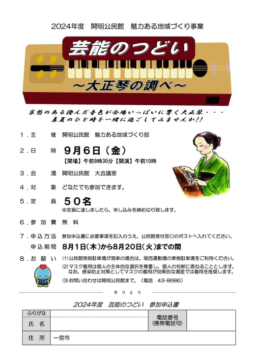 哀愁のある澄んだ音色が会場いっぱいに響く大正琴…。真夏のひと時を一緒に過ごしてみませんか。