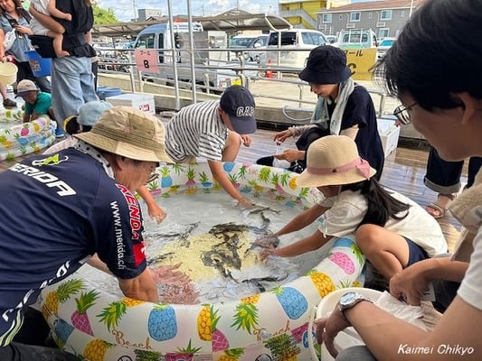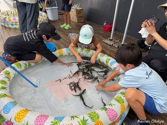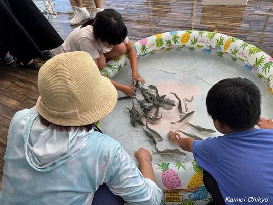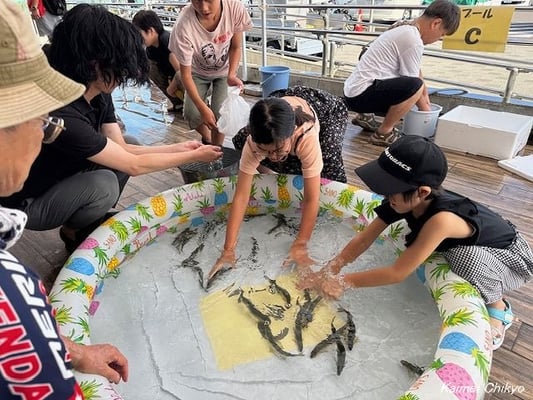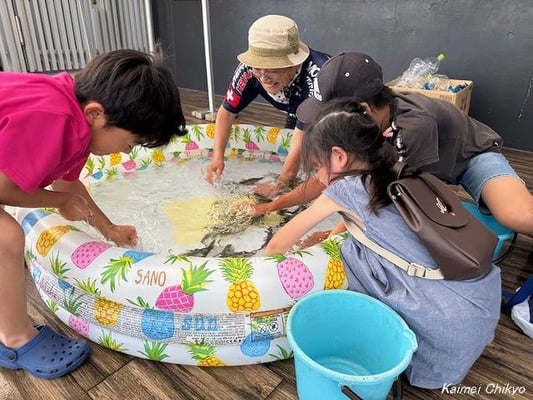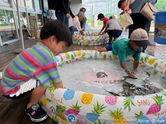 プールやバケツからアユが飛び出し、大声をあげて喜ぶ子どもたち。保護者のサポートを受け、無事氷を入れて持ち帰ることができました。