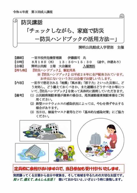 令和4年度第3回の成人講座として、防災講話「チェックしながら、家庭で防災ー防災ハンドブックの活用方法ー」を、8月18日(木)13時30分より公民館大会議室にて開催いたします。