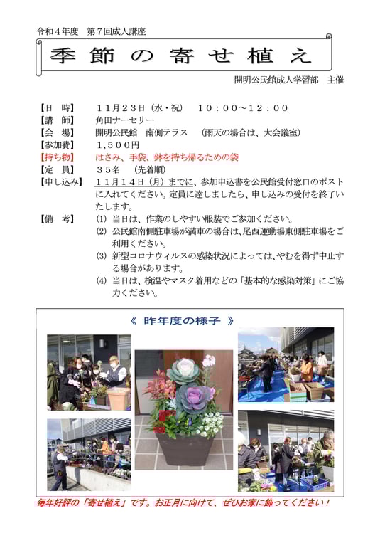 令和4年度第7回の成人講座として、「季節の寄せ植え」を、11月23日(水)勤労感謝の日に、今年も角田ナーセリーさんのご協力により実施いたします。