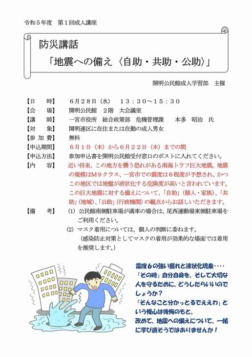 令和5年度の第1回成人講座として、防災講話「地震への備え〈自助・共助・公助〉」を、