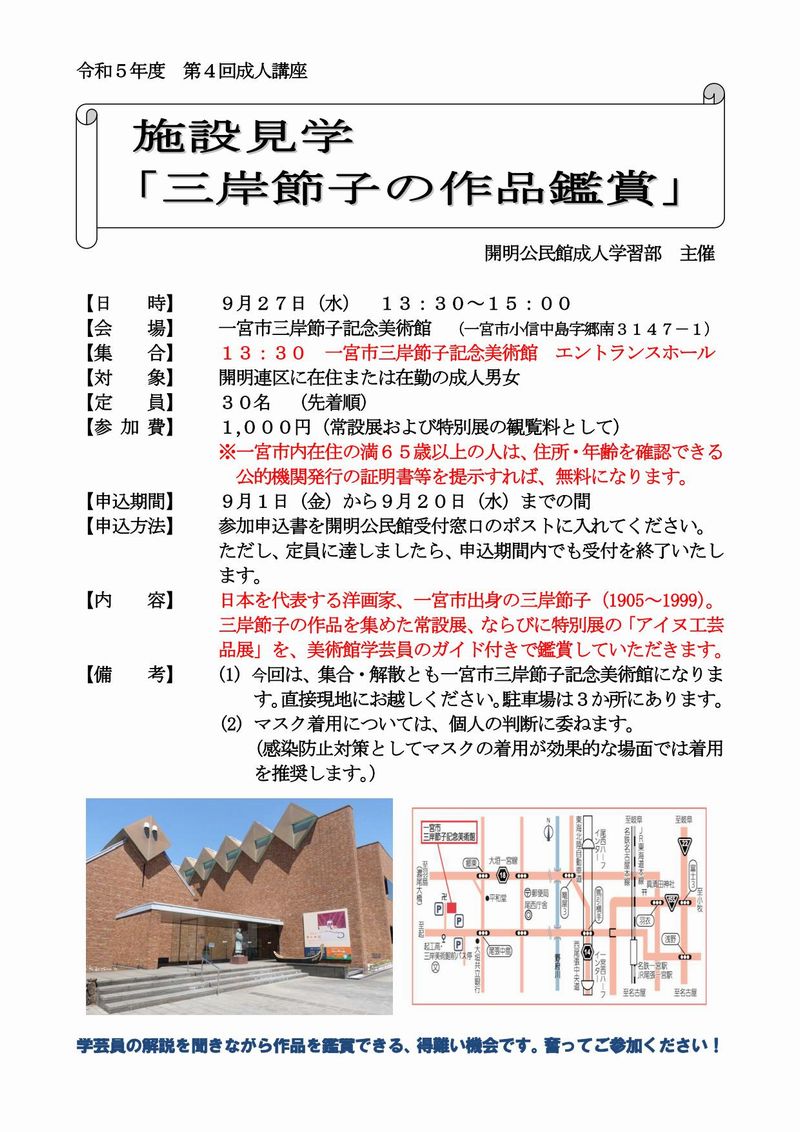 令和5年度の第4回成人講座として、施設見学「三岸節子の作品鑑賞」を、9月27日(水)13時30分より実施いたします。今回の会場は、開明公民館ではなく、一宮市三岸節子記念美術館です。現地集合、現地解散となります。