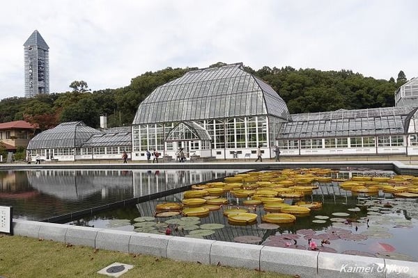 次は植物園です。洋風庭園を通り、重要文化財の温室の中を見学。それから坂を上って、武家屋敷門、他有園、奥池、合掌造りの家、さらに日本庭園へと歩を進めました。