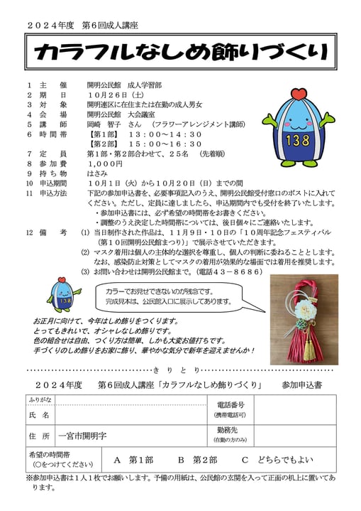 2024年度の第6回成人講座として、「カラフルなしめ飾りづくり」を、10月26日(土)に、公民館大会議室にて開催いたします。