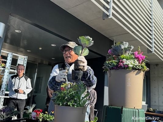 岸上さんからは、「葉牡丹の前後の組合せや鉢の中央に配置が決まれば、あとは他の花をバランスよく植えることでほぼ完成」等、見栄えのポイントや苗の取扱の注意点の説明がありました。