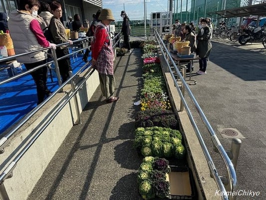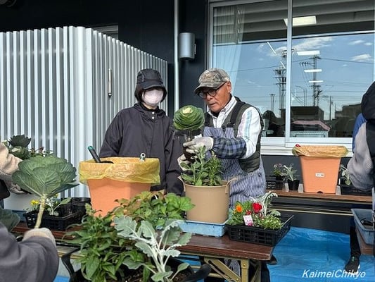 参加者は、葉牡丹、ジュリアン、ビオラなどの花苗、葉ものの苗など8種類を選び、岸上さんや岡本さんの手ほどきを受けながら苗を植えました。