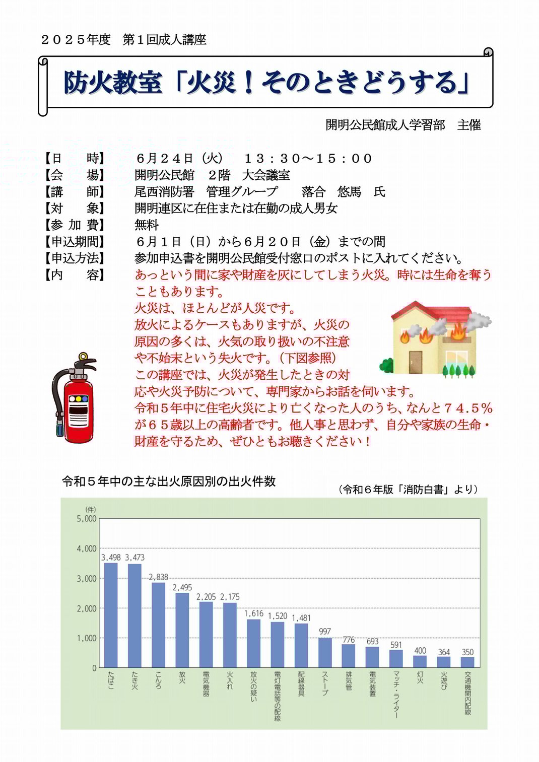 2025年度の第1回成人講座として、防火教室「火災!そのときどうする」を、6月24日(火)午後1時30分より公民館大会議室にて開催します。講師は、尾西消防署管理グループの落合悠馬氏にお願いしています。