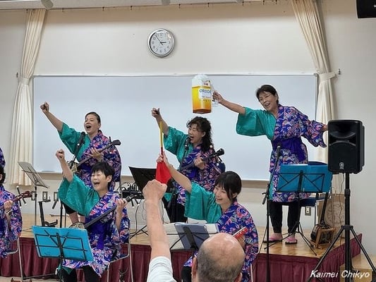 最後は、BIGINの「オジー自慢のオリオンビール」の歌と演奏で大いに盛り上がり、三線メンバーの小道具と皆さんエアジョキで「あり乾杯!」をしました。