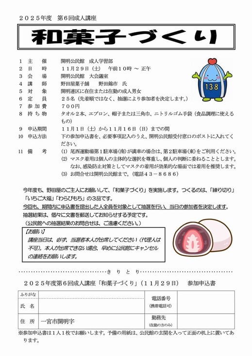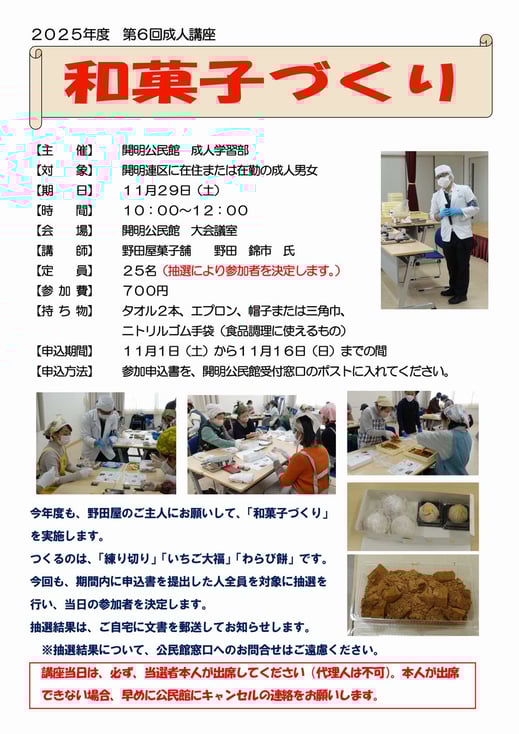 2025年度の第6回成人講座として、昨年度好評だった「和菓子づくり」を、11月29日(土)午前10時から、公民館大会議室にて開催します。