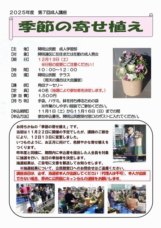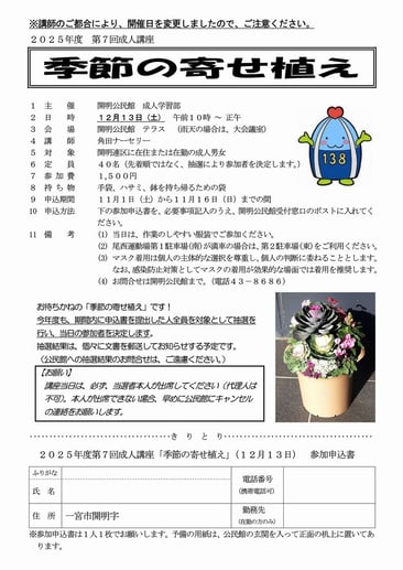毎年大人気の「季節の寄せ植え」を、今年度も実施します。ただし、講師である角田ナーセリーさんのご都合により、開催日を当初の予定から変更しましたので、ご注意ください。