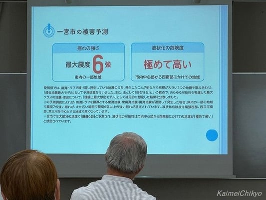 一宮市では「津波なし」、揺れの強さは10段階の内の9段階「震度6強」、市内中心部から西南部にかけての地域で液状化の危険度が「極めて高い」と予測されています。開明連区は「液状化の危険度が極めて高い」地区にあたり、液状化の被害を想定した対策が必要だと感じました。