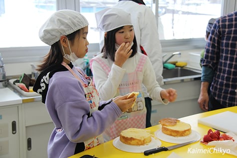 (いらない部分のスポンジを試食する子どもたち)