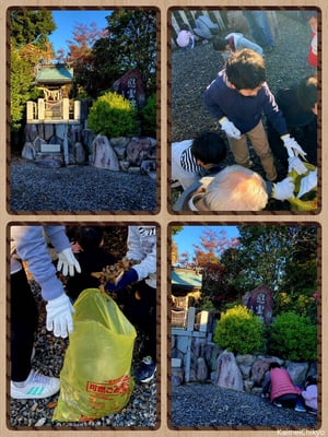 まずは将監天王社の清掃をしました。大人では入りにくい低い所に子ども達が入り、たまっていた落ち葉をたくさん集めてくれました。とてもきれいになりました。